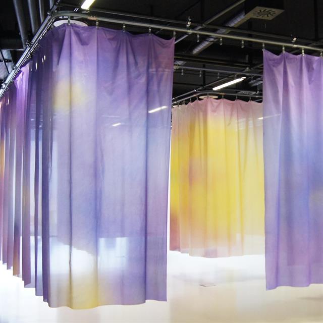 Dans la salle d'exposition du Pavillon Blanc, le visiteur pénètre dans un labyrinthe de rideaux aux mouvements contradictoires dans une expérience immersive.